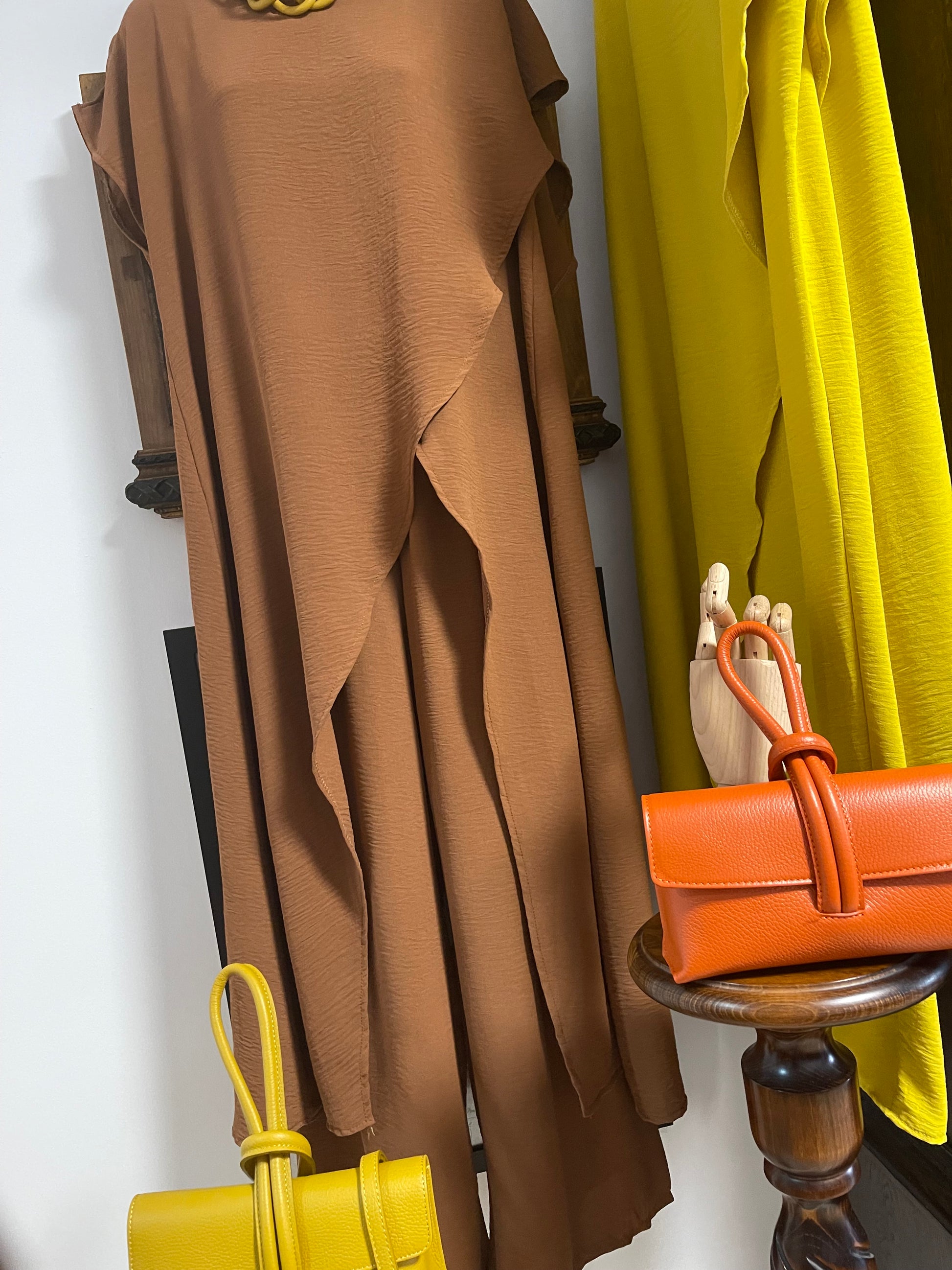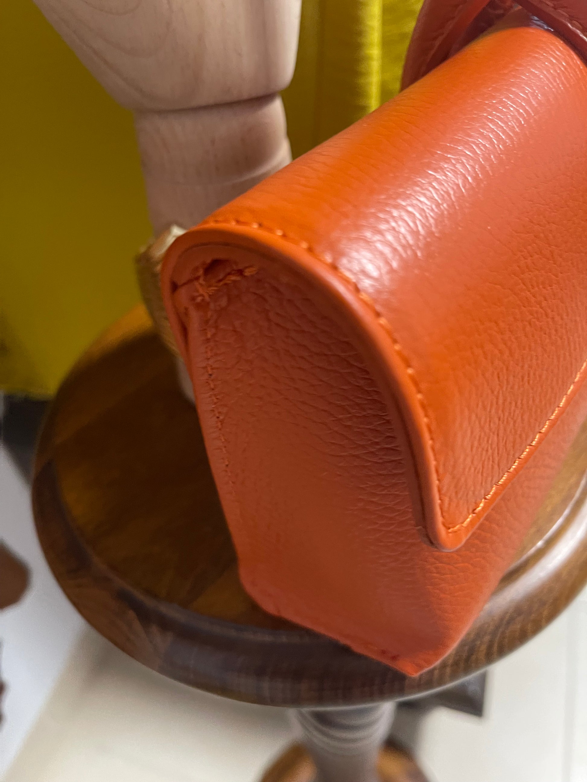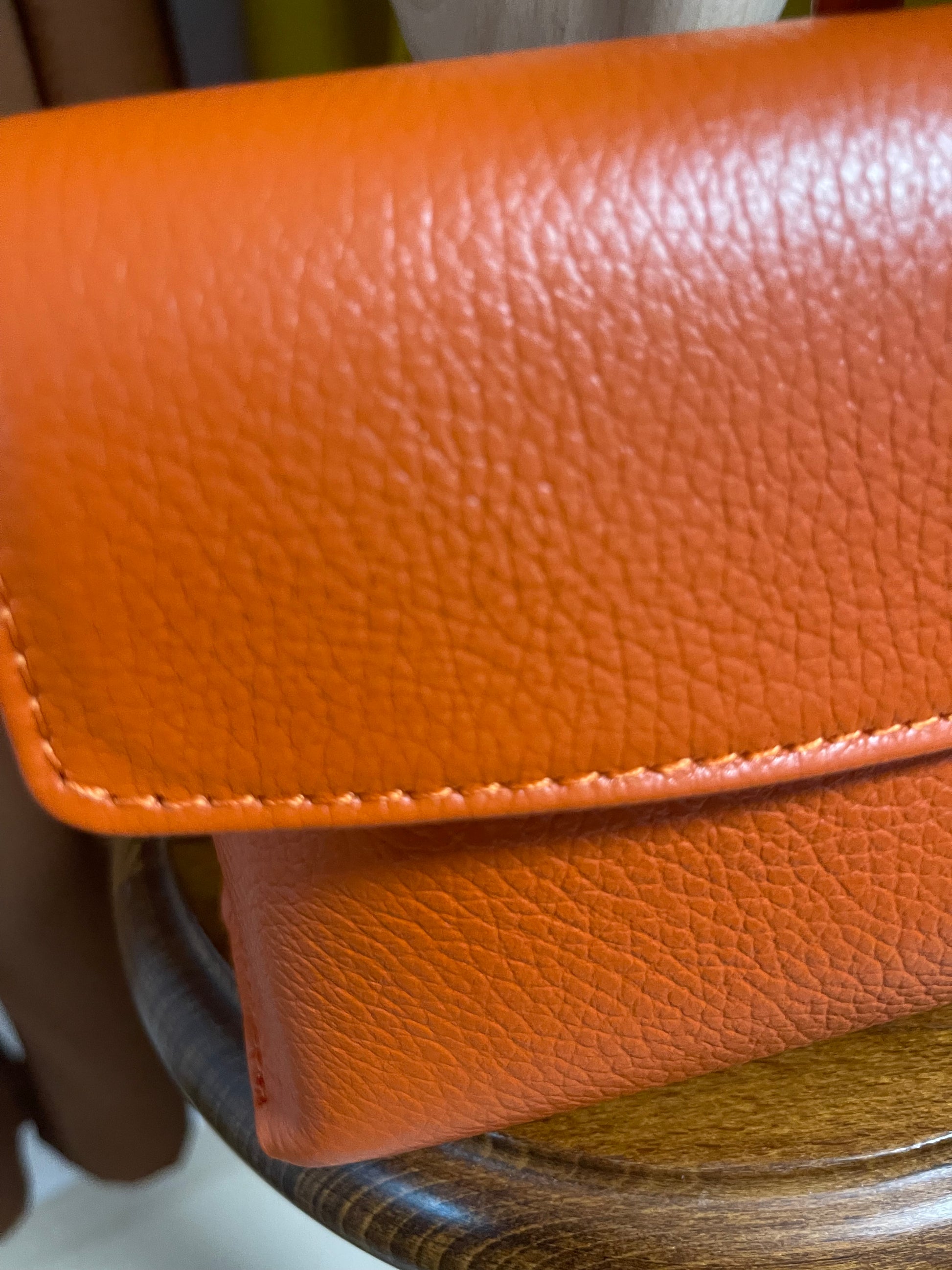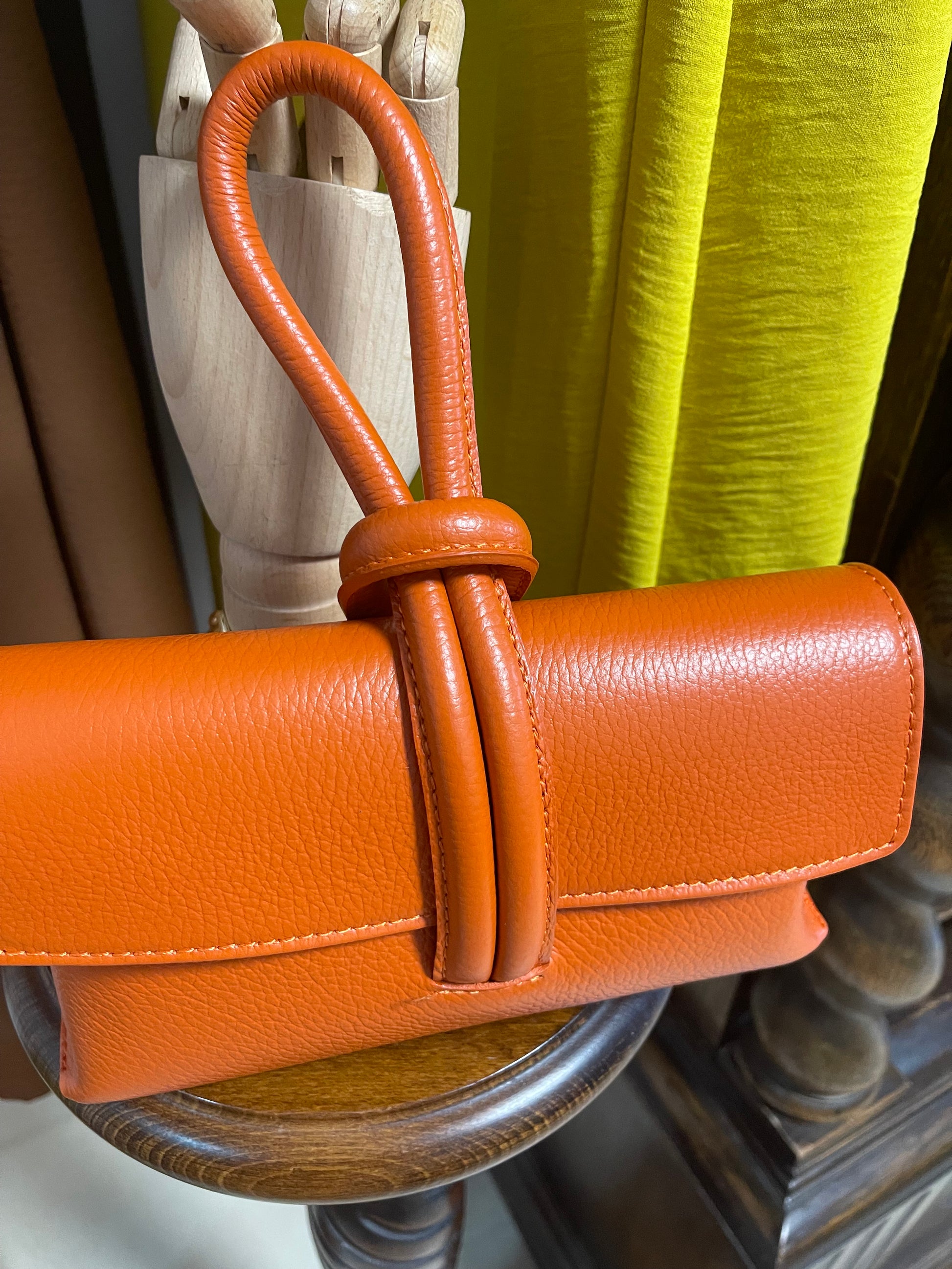 Orange genuine leather wristlet bag with inner pockets and optional long leather strap