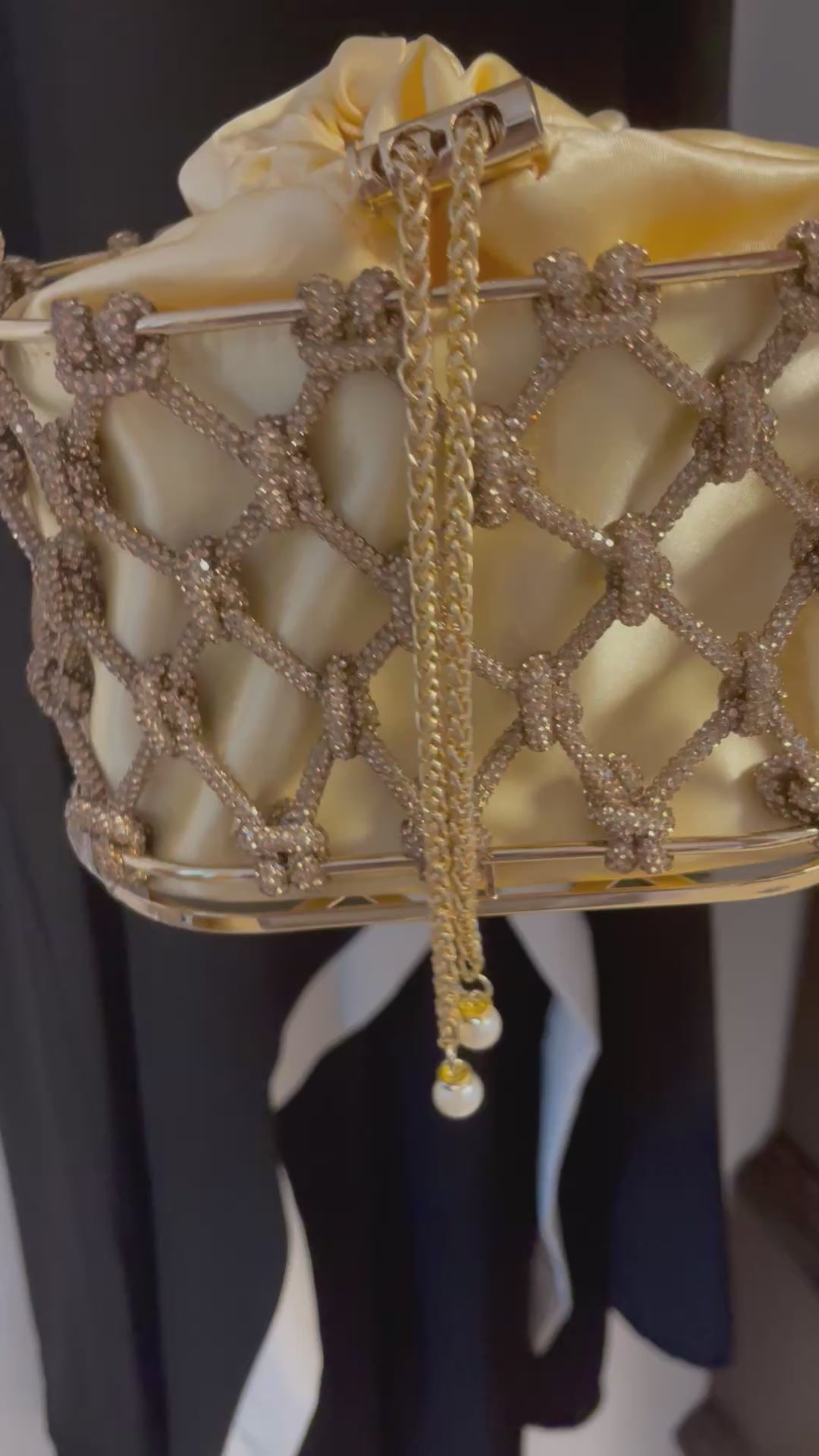 Gold metal caged bag with inner pouch closed by sea string with imense detail also has long chain strap