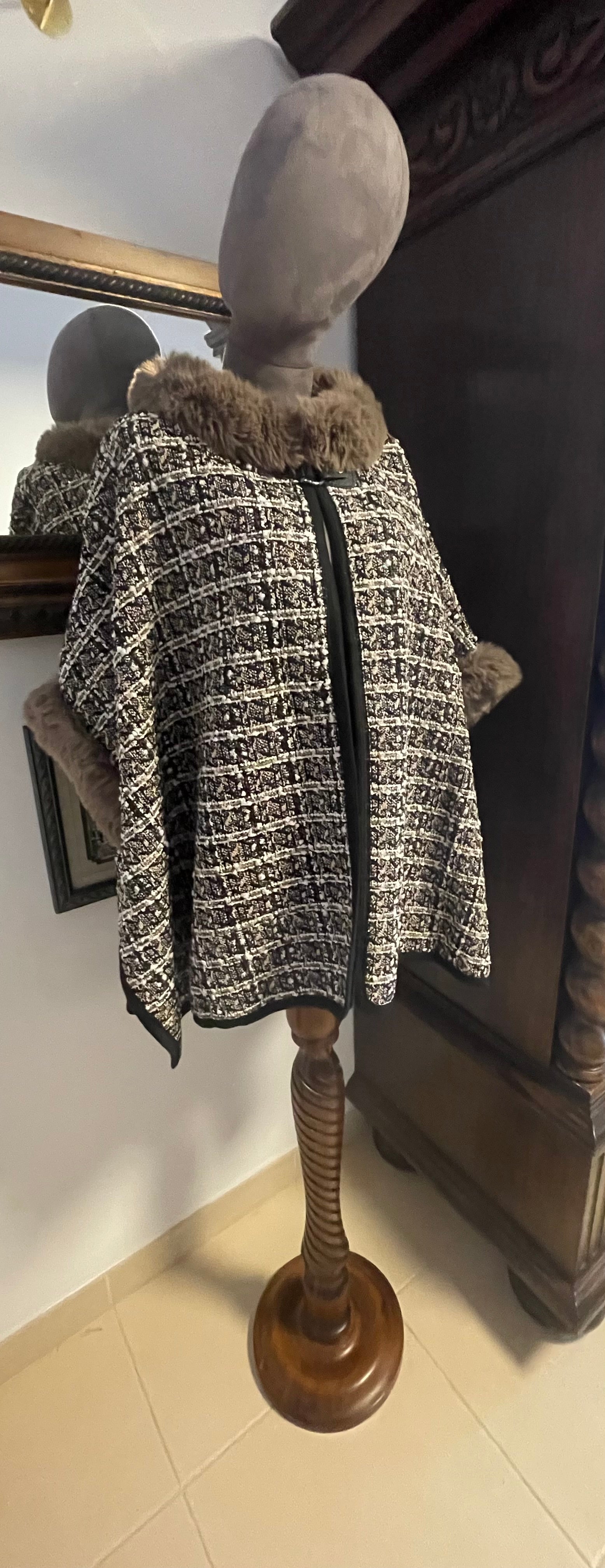 Grey faux fur and tweed cape it’s fleecelined inside and fits 12-18 it has beautiful fine threads of gold running through it also
