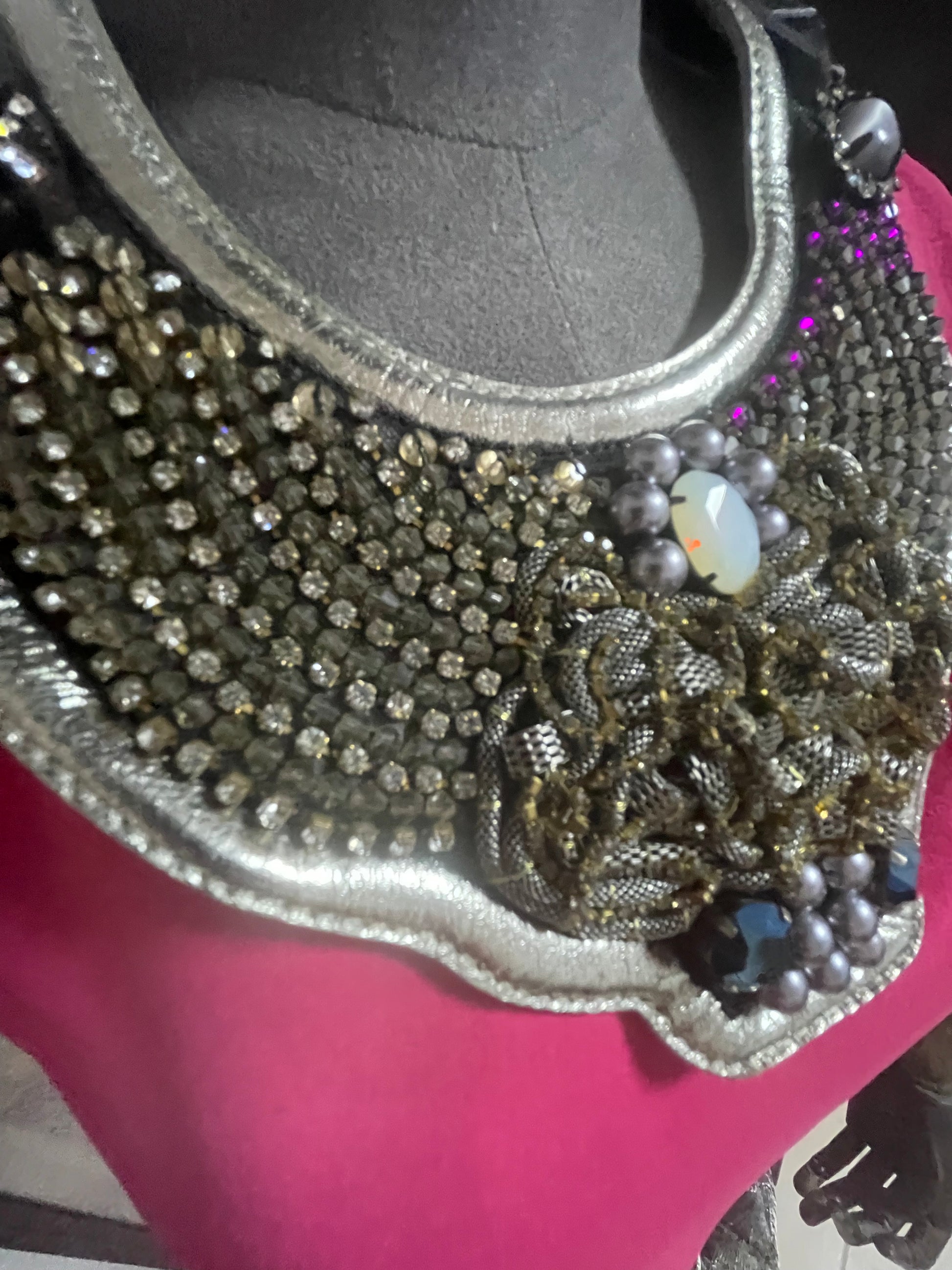 Oozing detail of bead work and gems this large ornate bib neckpiece is a statement ….. set on leatherette with ribbon tie closing…. Can be worn up on the neck or down lower. Made by Irish designer Joanne Hynes