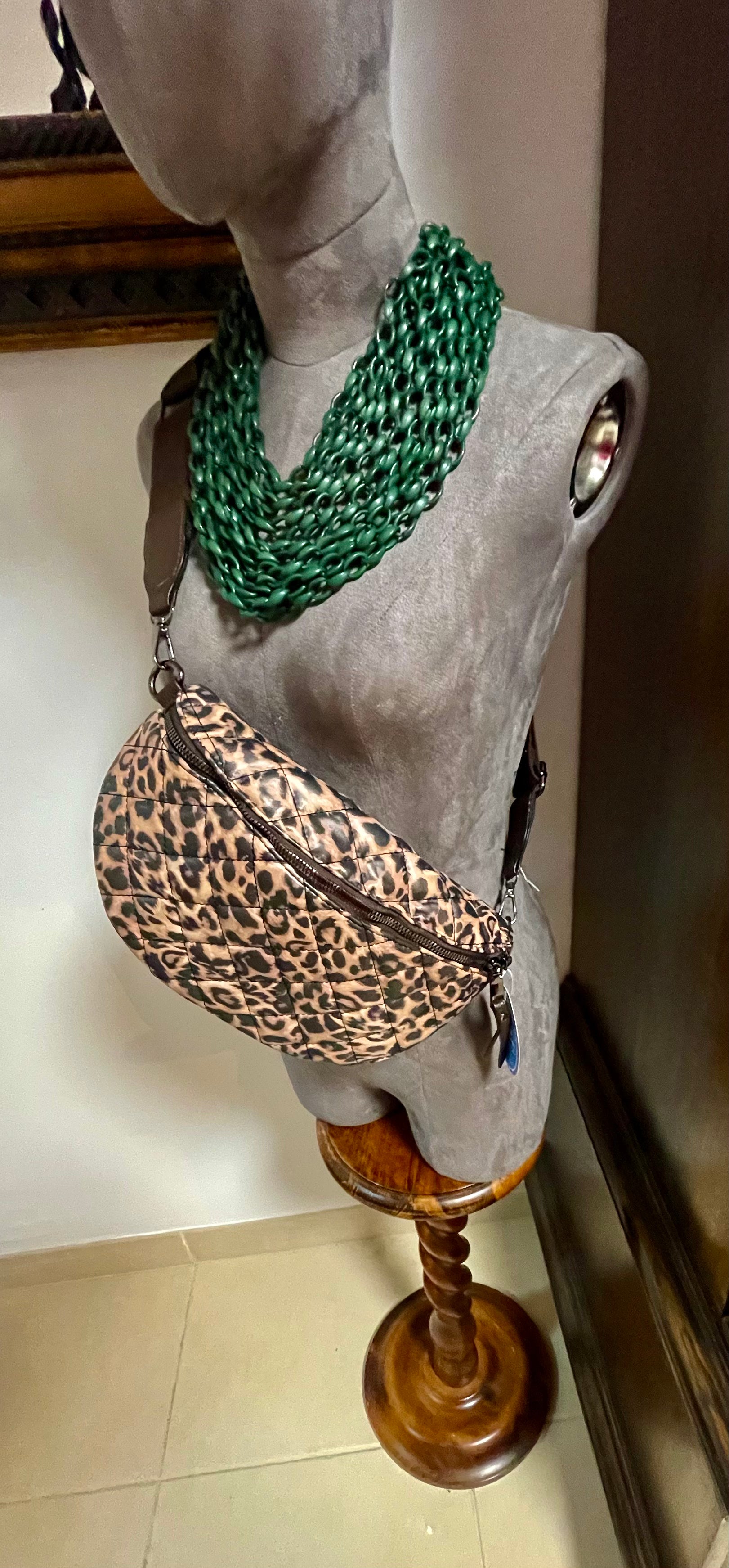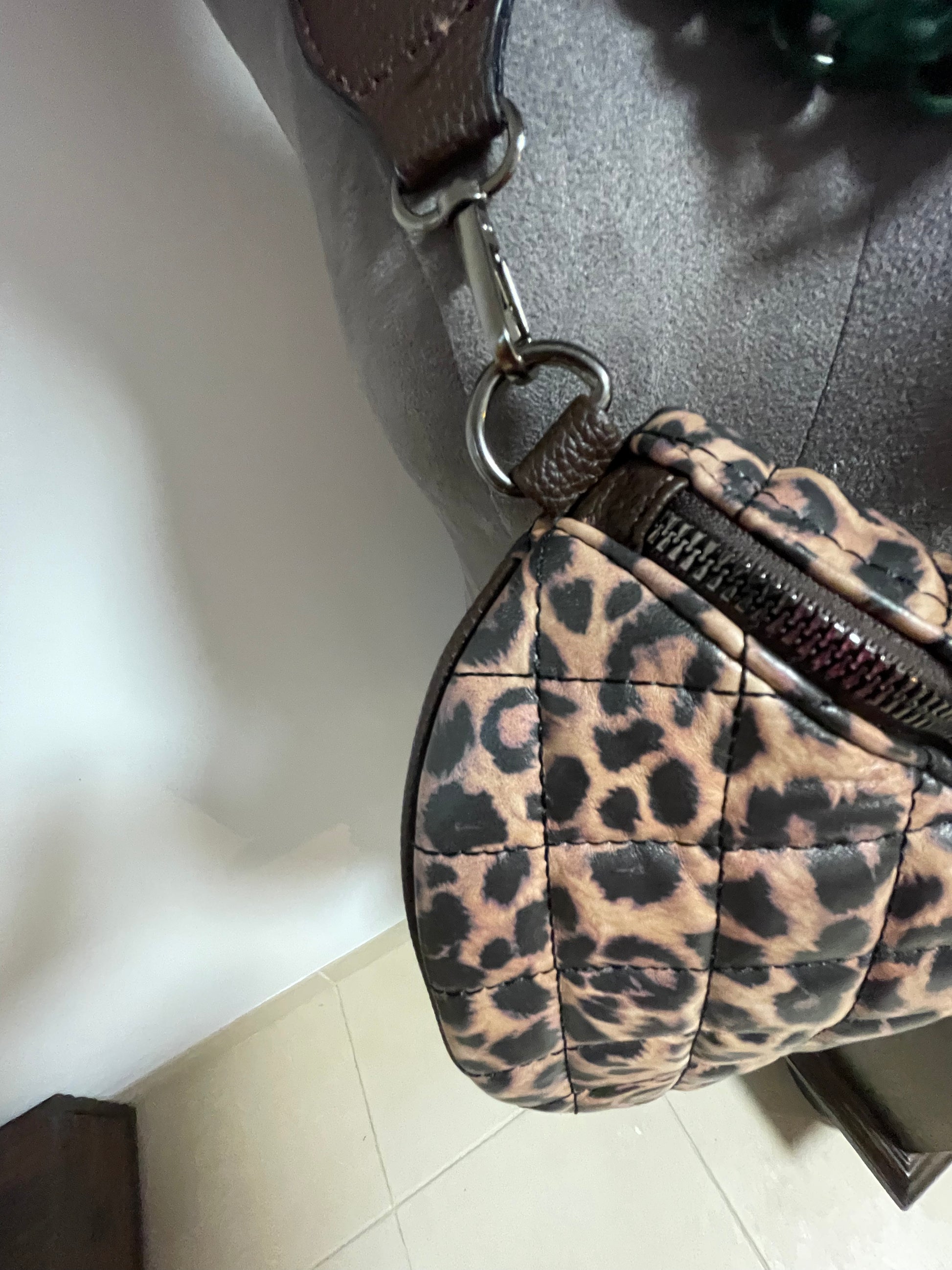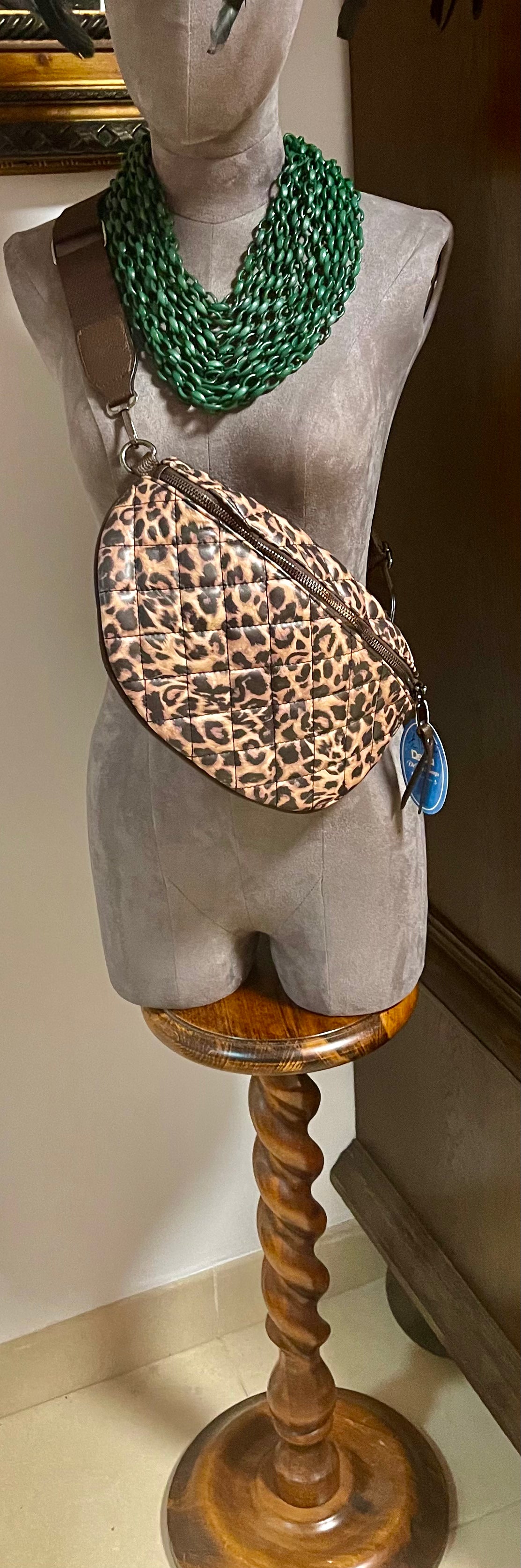 Large quilted leopard print bumbag with zipper closing and long comfortable adjustable strap in brown