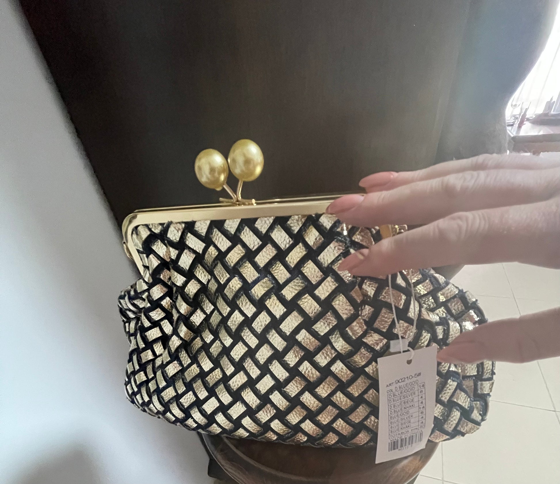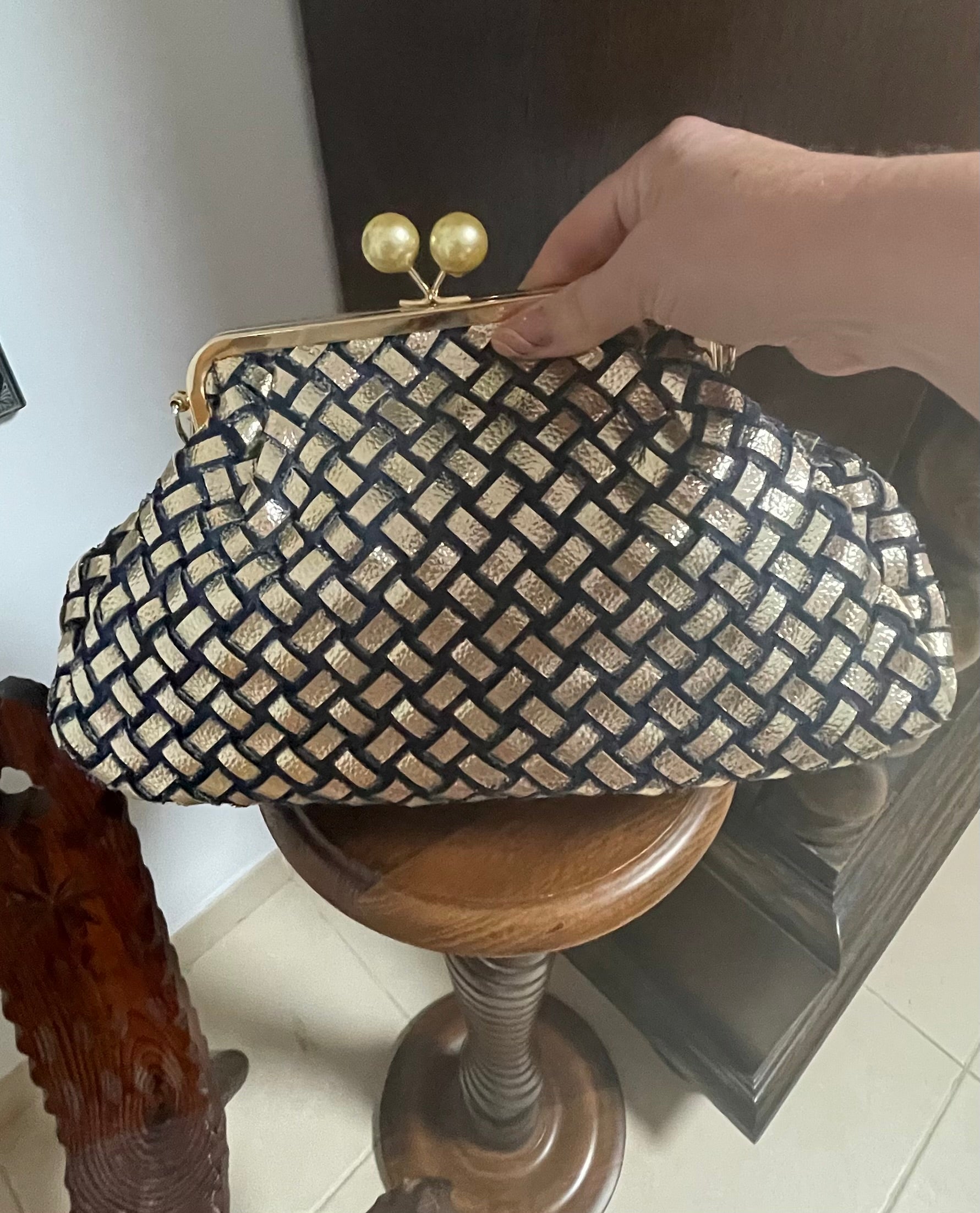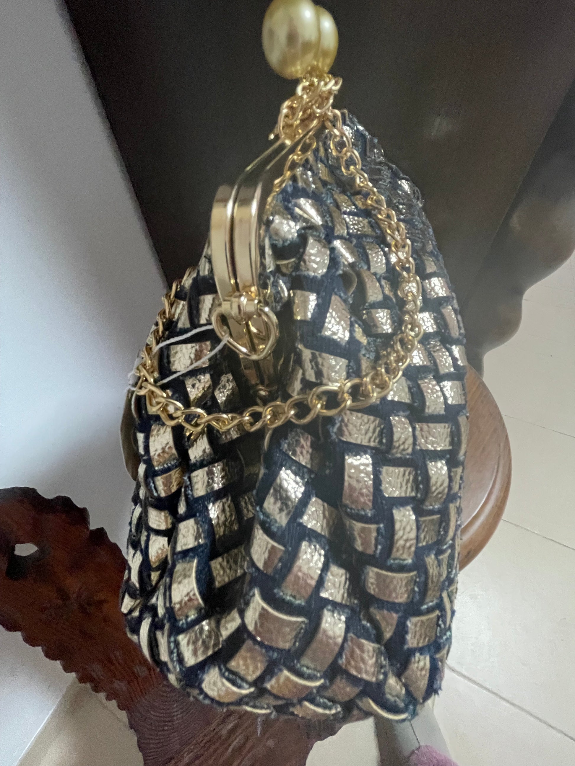 Beautiful navy and gold patterned soft midsized clutch with inner compartments and long chain strap